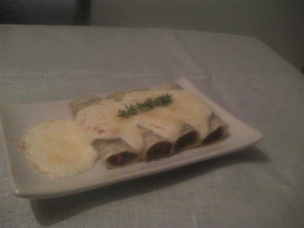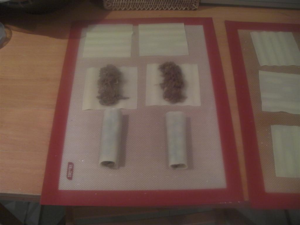 Mientras, había hervido las placas de canelones, los dispuse en un silpat, los rellené y los enrrollé.