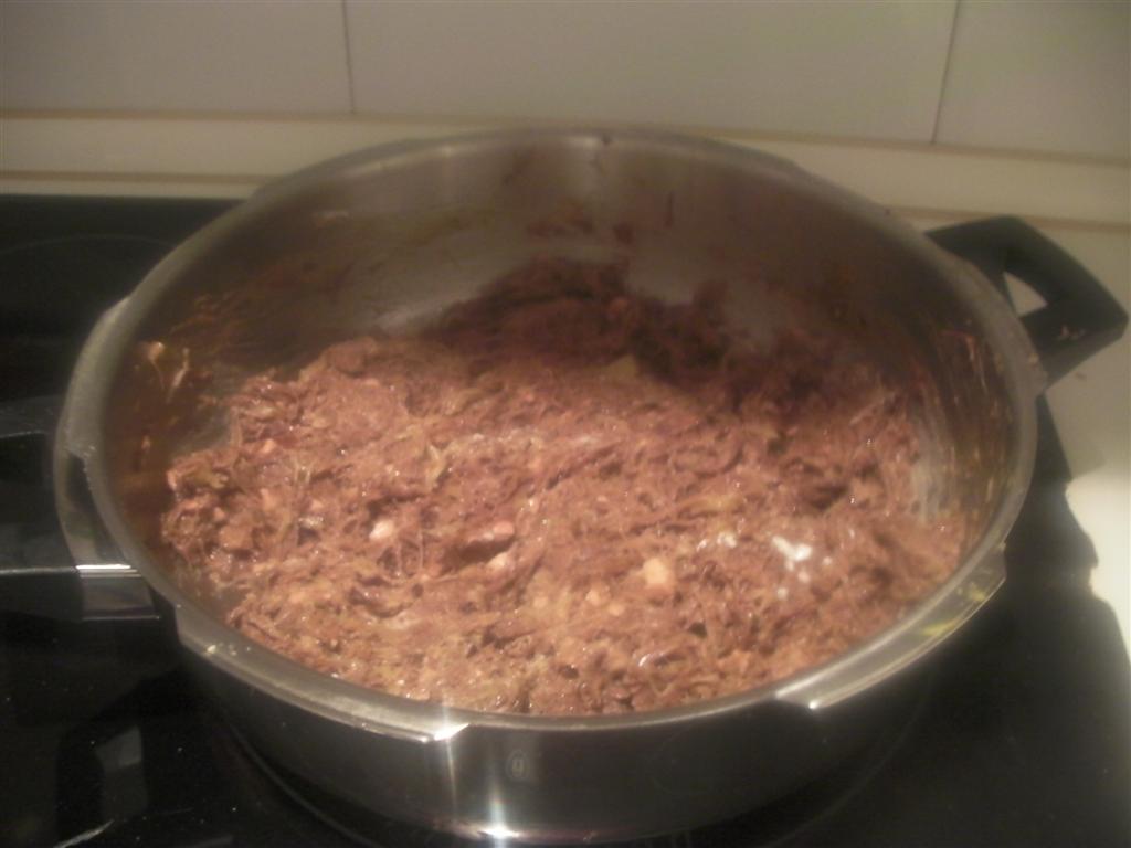 La clave está en rehidratar la carne, que ha perdido la mayoría de sus jugos en la cocción del consomé. Para eso nada mejor que algo del propio caldo, o, como en este caso, los restos de la glasa que preparé como salsa del fondo oscuro de ternera del roast beef. Y como también hay que darle sabor, eché todo lo que fui pillando por el frigorífico. El resultado, un gran plato de esos improvisados sobre la marcha, y por lo tanto irrepetibles. Las proporciones que pongo aquí son, evidentemente, a ojo.