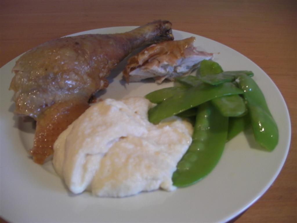 Et voilá!. Aquí está nuestro pollo que nos ha dado para tanto rato de regocijo. Acompañado este día de un puré de apio-nabo y unos tirabeques cocidos al vapor.
