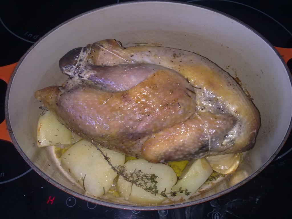 La preparé siguiendo la misma receta del libro Todo Robuchon que cuenta Christophe aquí y aquí. La estrategia del famoso chef francés para superar el dilema del ave asada consiste en bridar la pintada para que mantenga la forma y en cambiarla de posición sucesivamente para que las alas y los cuartos traseros sean los que reciban más calor al estar en contacto directo con la fuente en la que se hornea.