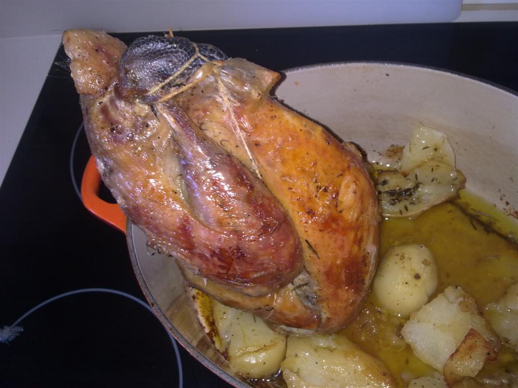 Introducimos en el horno y tenemos 20 minutos. Pasado el tiempo giramos media vuelta el ave para que quede en la misma posición pero apoyada en el otro lado (sobre el otro muslo y ala).
