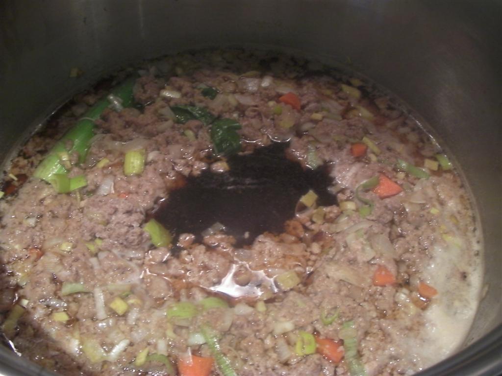 Partimos de ingredientes fríos. Montamos ligeramente las claras (para que floten mejor y no sea tan importante remover al principio) y las batimos con la carne y las verduras picadas. Reservamos en el frigorífico hasta el momento de usar. Hay quien también añade algo de ácido —vinagre, zumo de limón o pasta de tomate si no importa el color— que facilita algo la coagulación de las proteinas.