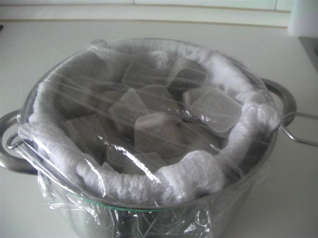 Finalmente descongelamos en el frigorífico colocando la mezcla congelada sobre un colador o bandeja agujerada en el que habremos puesto un filtro de café, varias capas superpuestas de gasa o estameña, o, lo que mejor me ha funcionado, una superbag de 100 micras. Si es posible, podemos tapar el conjunto con papel film para que no coja olores del frigo. La velocidad de este proceso depende de la temperatura del frigorífico, a 1ºC se eterniza, a 5ºC puede tardar entre 2 y 3 días.