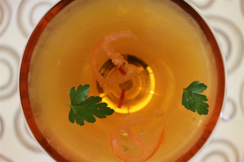 Este consomé lo vi en Umami Madrid, y tenía ganas de prepararlo desde hace tiempo. Para no limitarme a «copiar-y-pegar», la preparación es algo diferente, modificada a partir de una receta de Modernist Cuisine. En vez de infusionar los aromáticos básicos tailandeses en el fondo de pollo he preparado una pasta con esos aromáticos y unos cuantos más, que he pasado por la sartén antes de cocerla con el caldo. El resultado, un consomé potente potente, brutalmente aromático, sólo para paladares atrevidos.