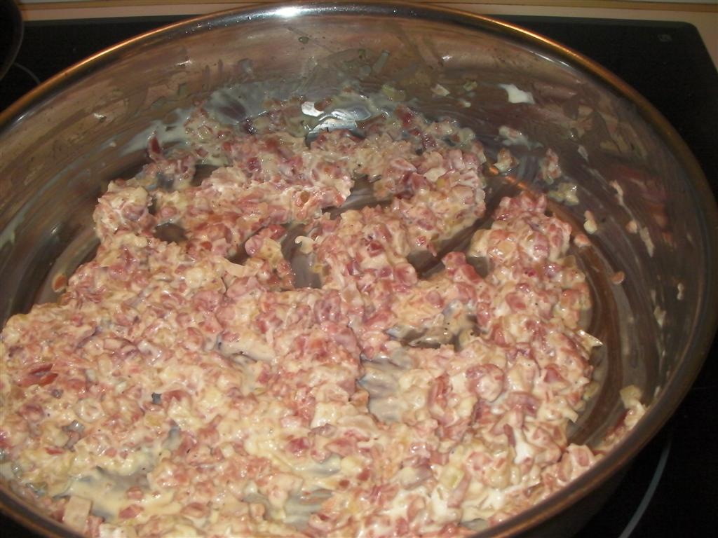 Mientras caramelizan, cortamos el jamón en trozos muy pequeños. Para hacerlo más fácil, suelo usar jamón precortado en lonchas muy finas.