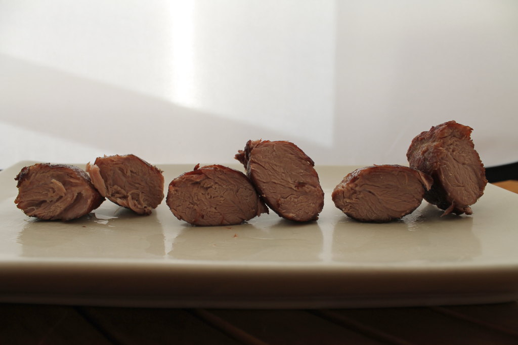 Lo que más me impactó fue lo último: que la mayor firmeza y cierta pérdida de «frescura» se aprecia incluso consumiendo directamente después de cocciones de un par de horas, tanto en el caso de la pechuga como del solomillo. Conclusión: con la mayoría de carnes es preferible salar después de cocinar, justo antes de proceder al acabado. Ojo, en ocasiones nos puede interesar el efecto «curado», p.e. con confits, o el efecto «firmeza», p.e. con pechugas destinadas a laminarse en frío para usar en sandwiches o ensaladas. Pero, en general, lo suyo es salar tras la cocción al vacío.