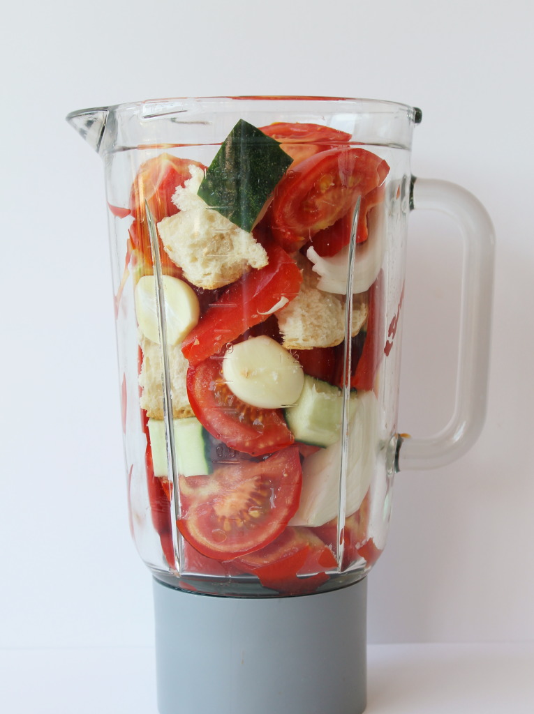 Si la batidora es pequeña y poco potente y no hemos macerado, es mejor empezar por triturar el tomate para obtener un jugo y después volcar el resto de ingredientes (o añadirlos desde el principio pero en la parte superior del vaso), ya que los más duros como el ajo o el pimiento pueden llegar a bloquear las cuchillas.