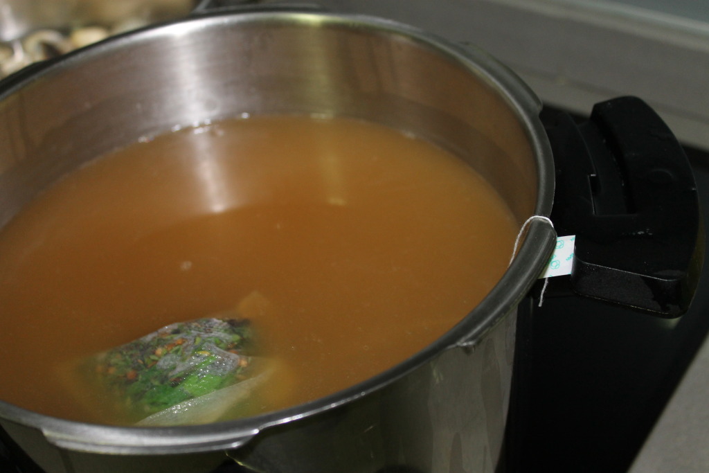 Al recalentar el caldo para servir añadiremos las especias y hierbas aromáticas para que infusionen. Para retirarlas rápido y sin necesidad de volver a colar podemos formar un saquito con gasa o usar bolsas de té como en la foto.