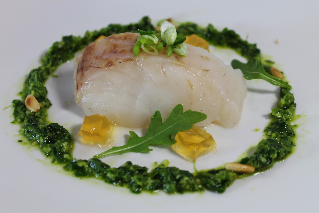 Merluza con pesto es una combinación que oí mencionar en Twitter al influencer Jesús Fernández Prieto y que funciona. Le damos aún más cera con unos dados de gelatina de caldo de cocido como los que usé para la tostada con lardo.