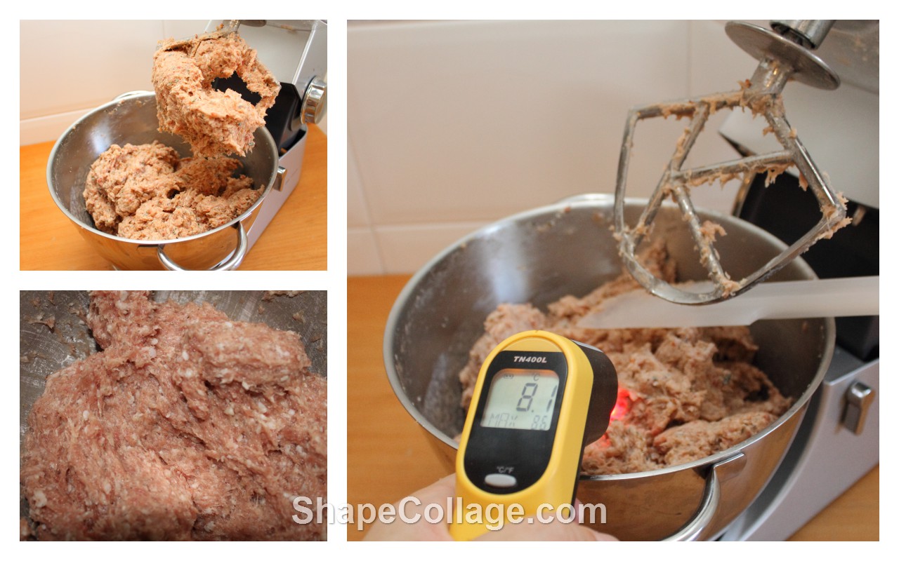 El procedimiento consiste en dividir el líquido de la receta, semi-congelado, en tres partes iguales. Primero, trituramos la carne picada más magra con un tercio del líquido hasta obtener una pasta homogénea. Entonces añadimos el resto de la carne picada, otro tercio del líquido y seguimos triturando. Por último incorporamos la grasa picada y el último tercio del líquido y terminamos de triturar.