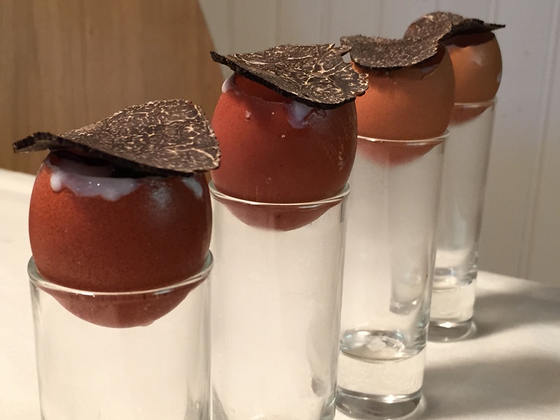 • Huevos de pollitas ampurdanesas y penedesencas 63ºC, en su cáscara «a modo de chupito», con trufa negra; y huevos de periquita 63ºC de la misma forma, con trufa blanca