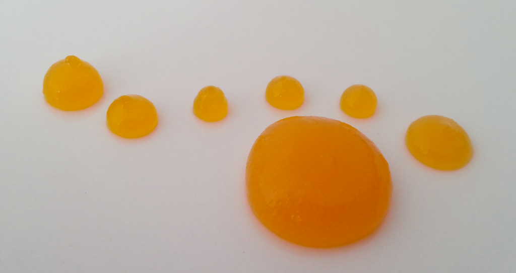 Los geles fluidos aportan varias ventajas en la cocina. Nos permiten incorporar a un plato el sabor y el aroma de un líquido en situaciones en que el líquido directamente no sería muy adecuado. Además, ofrecen una excelente liberación de sabor y una textura limpia en boca, ya que requieren cantidades minúsuculas de hidrocoloides que no interfieren en sabor. Nos abren la puerta a modificar la textura del líquido volviéndolo untable y maleable, casi como un puré o una salsa, lo que ofrece nuevas posibilidades texturales. Y esto además puede dar lugar vistosas presentaciones, que se explotan mucho en los emplatados modernos. Se han vuelto habituales las «gotas» de distintos tamaños formando patrones geométricos, muy sencillas de hacer usando un biberón de cocina, tal como se ilustra en las siguientes fotos: