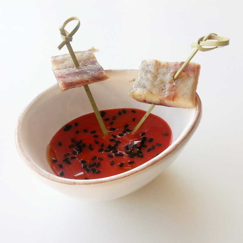 La guarnición de fresas asadas/semi-deshidratadas y guanciale es de EMP, pero se puede presentar de mil maneras, p.e. esta vez también lo usé para un aperitivo con anguila ahumada.