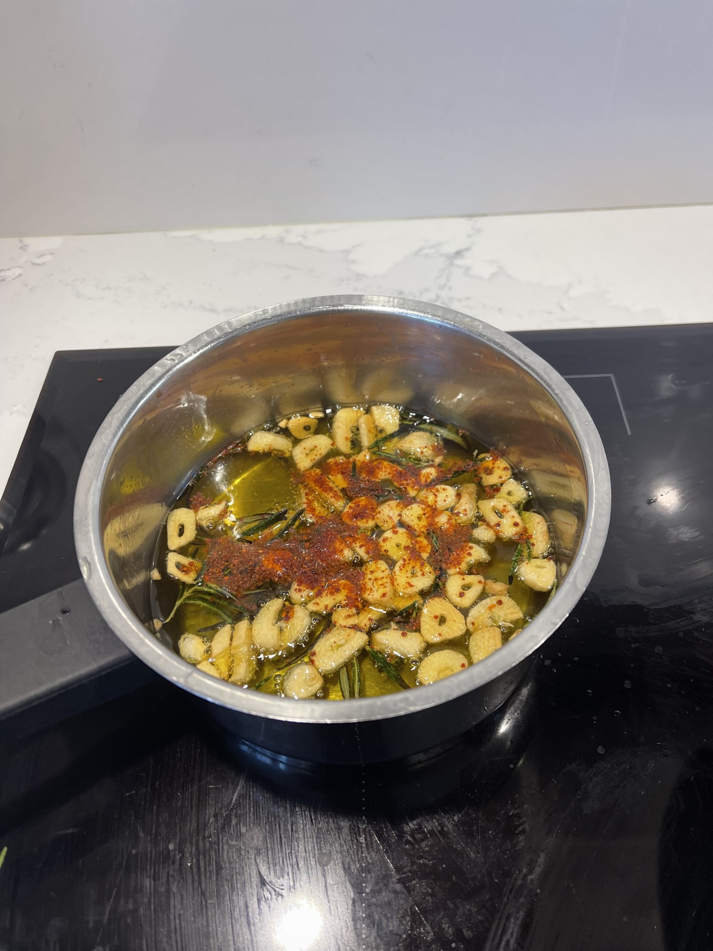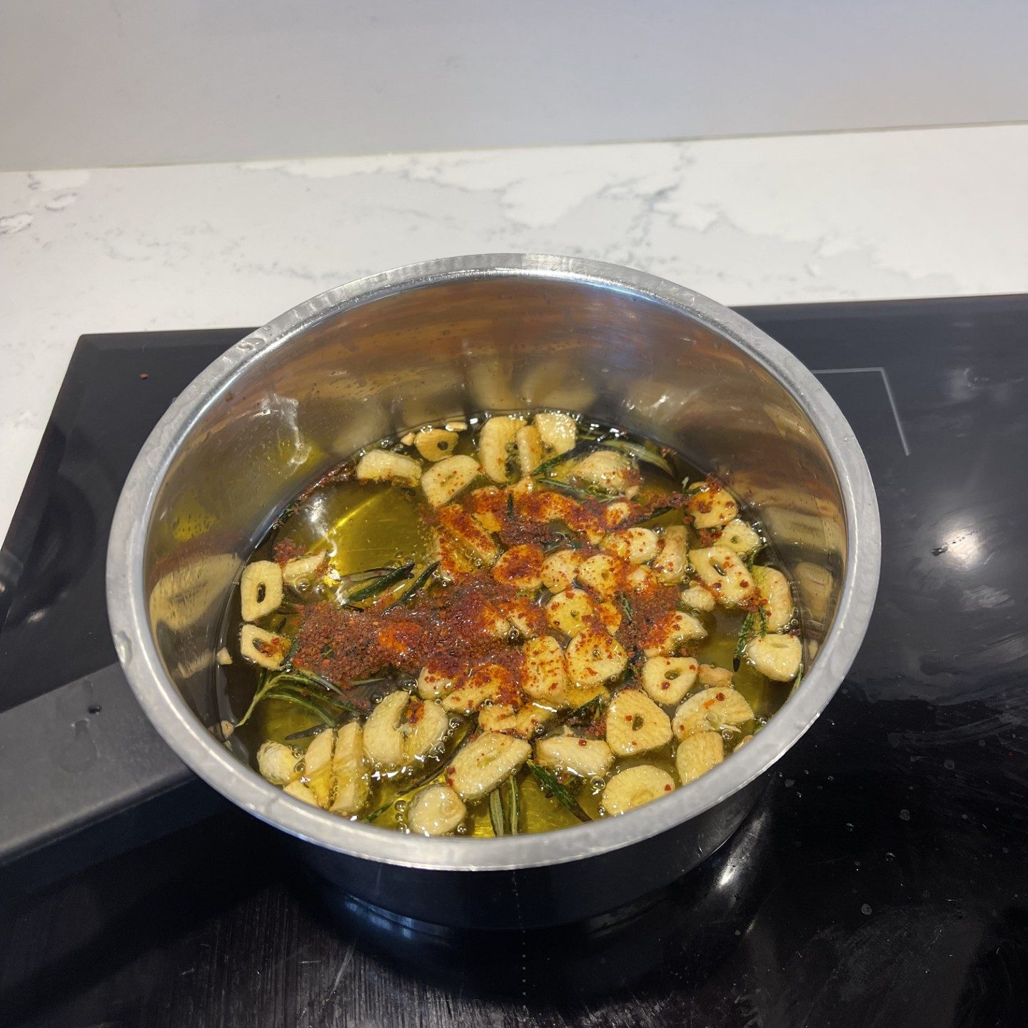 Ponemos a calentar el horno a 180ºC con calor arriba y abajo y ventilación. Calentamos el aceite infusionado en un cazo hasta 180ºC.