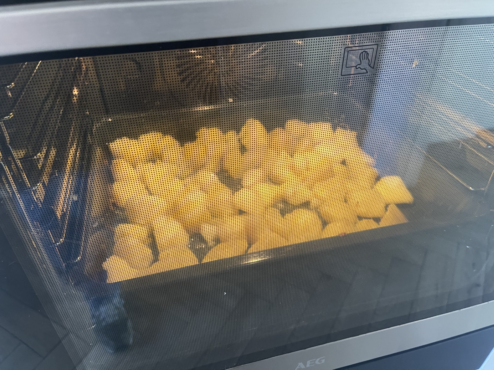 Ponemos agua a hervir con la sal y el bicarbonato, que ayudará a que se desmoronen ligeramente y a que tuesten mejor en el horno. Añadimos las patatas cuando el agua esté hirviendo, bajamos el fuego, y mantenemos una ebullición leve hasta que las patatas empiecen a deshacerse ligeramente, entre 10 y 20 min dependiendo de las patatas. Hay que vigilarlas todo el rato ya que puede ser difícil encontrar el punto exacto en que la superficie se deshace ligeramente, produciendo rugosidades que luego tuestan maravillosamente, pero no llega a desmoronarse la pieza. Con cuidado las sacamos poco a poco a una rejilla para que se sequen.
