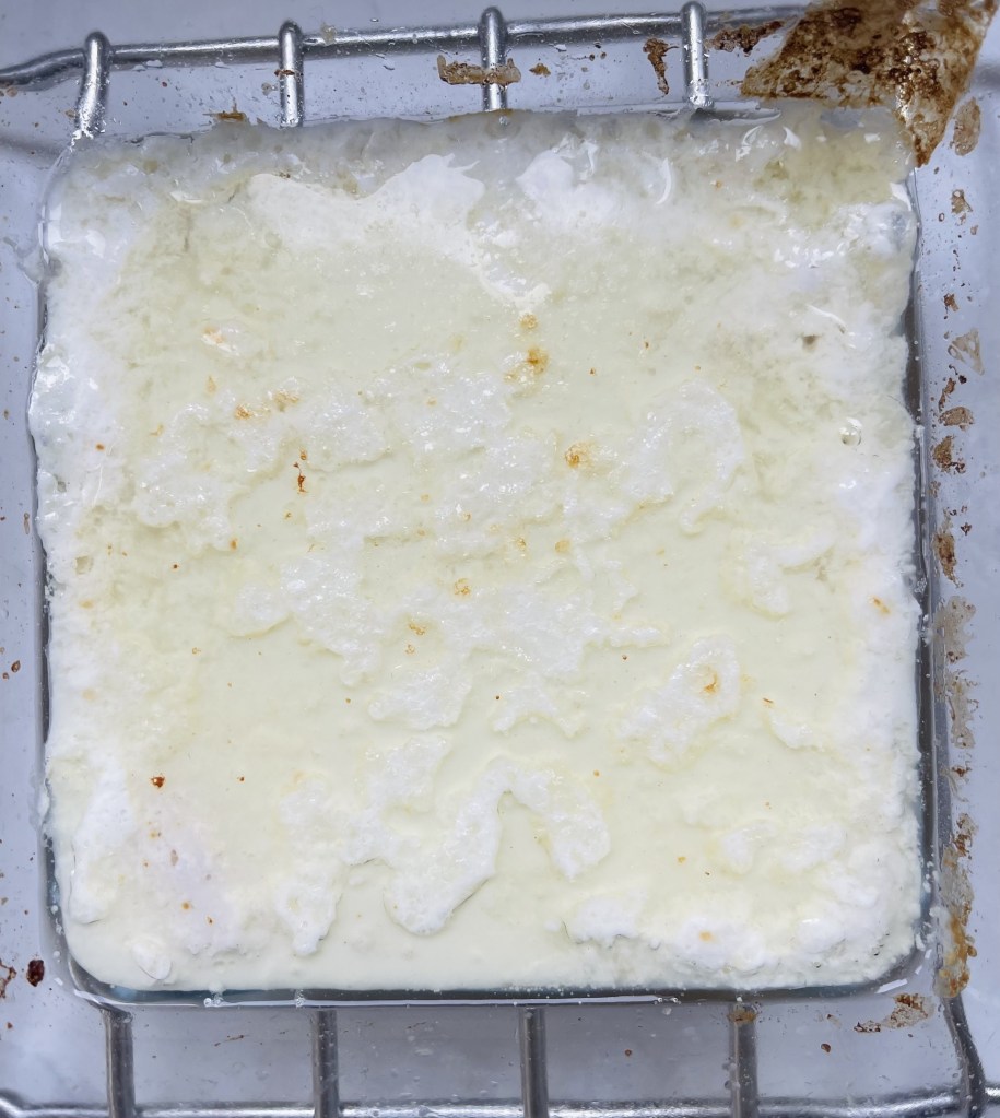 Rallamos el parmesano y lo gratinamos en el grill del horno (en el mío, 10 min a 230ºC). Añadimos la leche caliente y gratinamos unos minutos más (en el mío, otros 3 min a 230ºC). Aunque se separa la grasa, el batido posterior con la ayuda opcional de la xantana, que actúa como emulsionante, volverá a integrar el conjunto. Incorporamos la mantequilla fría en cubos y la xantana, y batimos.