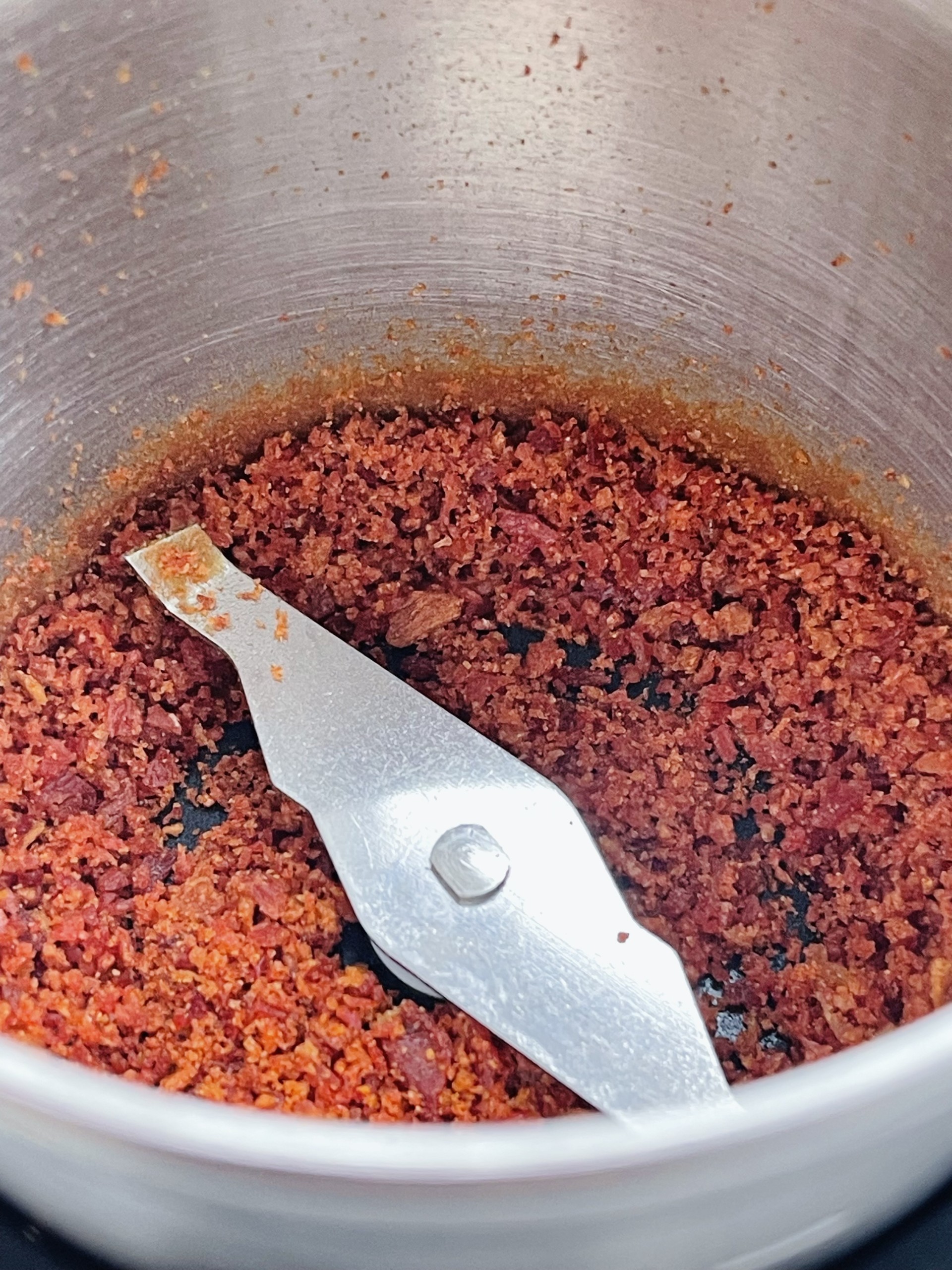 Cuando se enfríen, desmenuzamos los trozos y los pasamos por un molinillo eléctrico para reducir a polvo. Reservamos, no es necesario que sea en el frigorífico.