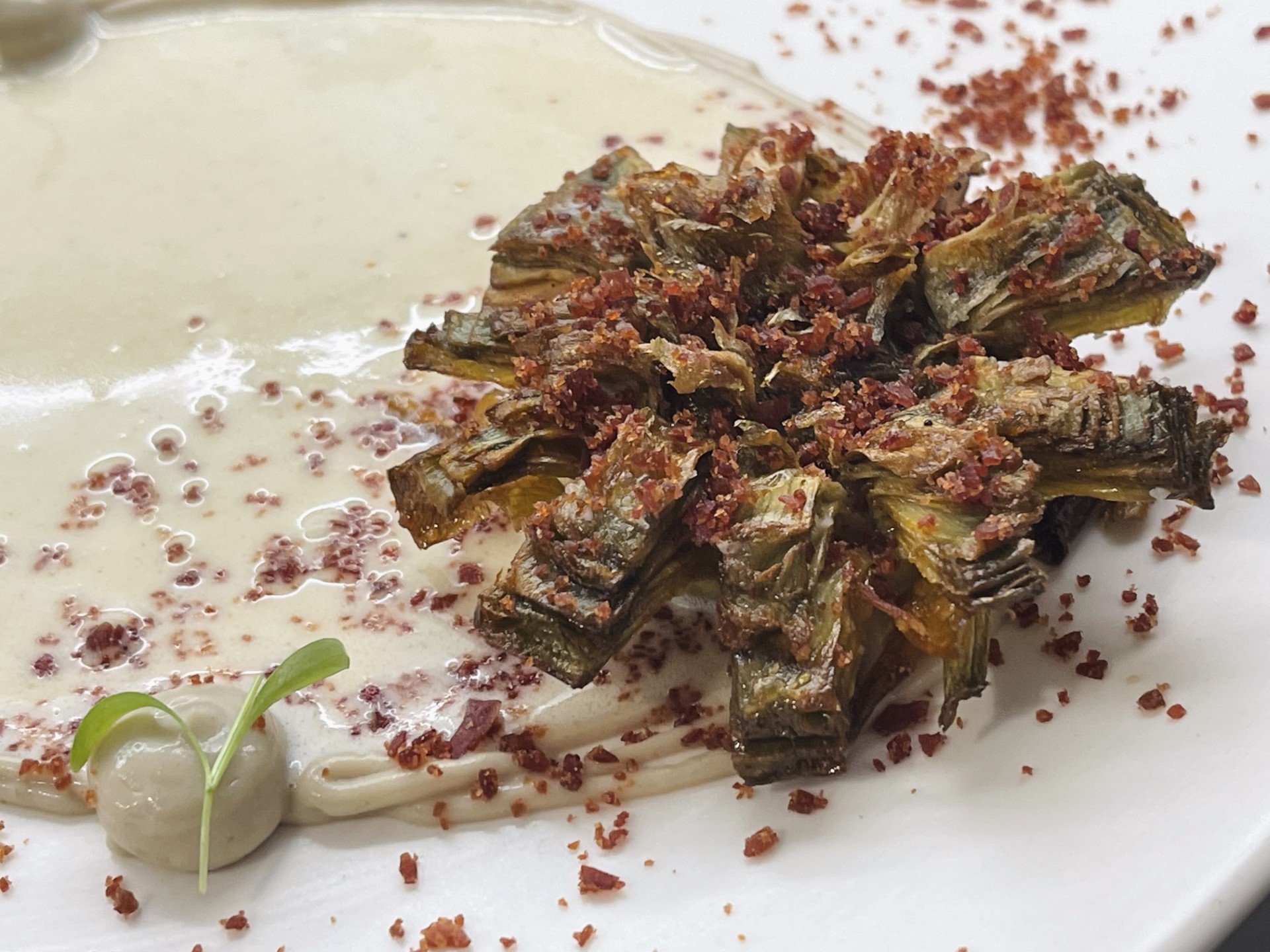 Finalizamos espolvoreando la «sal» o «polvo» de jamón por encima de la alcachofa.