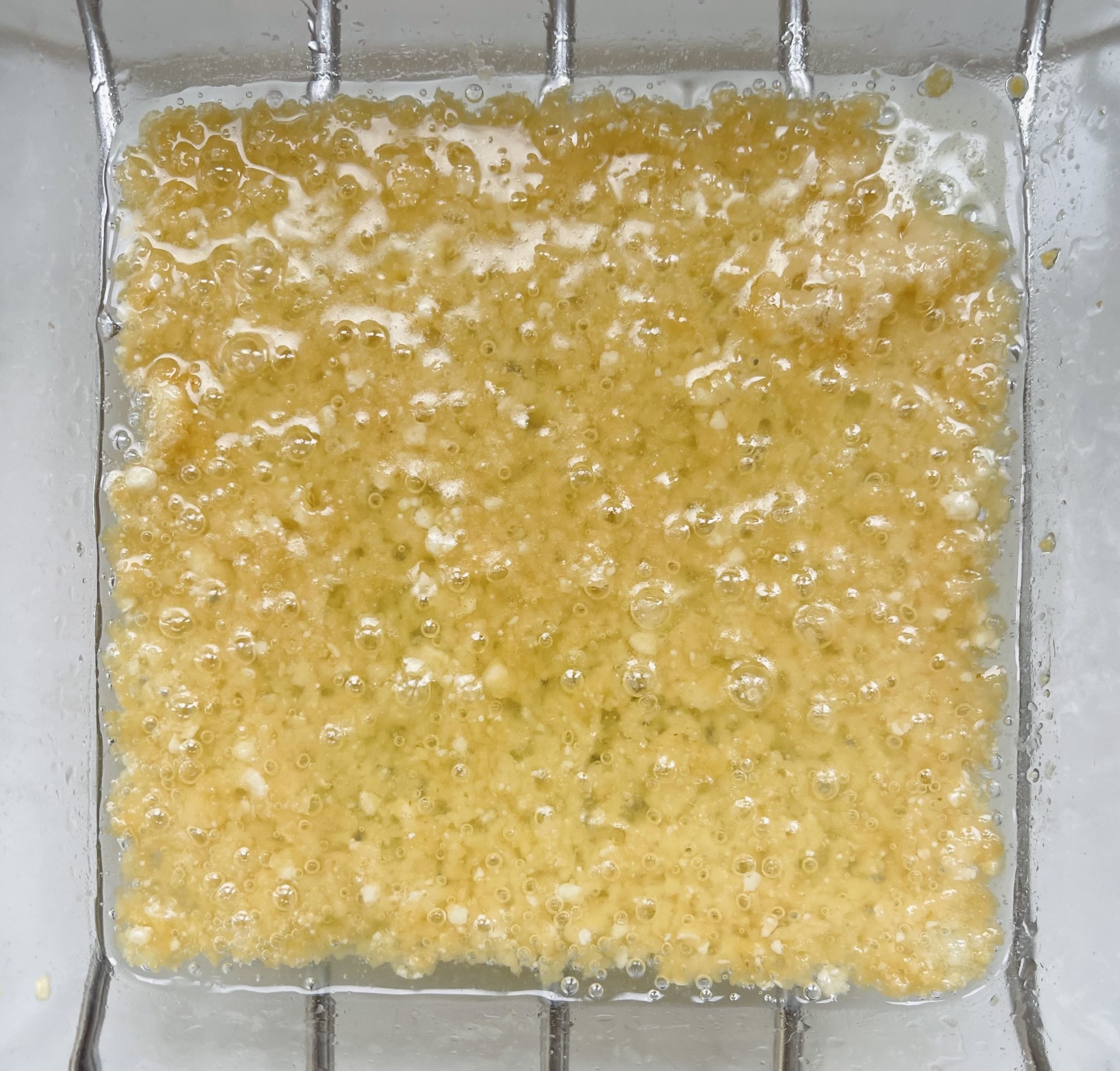 Rallamos el parmesano y lo gratinamos en el grill del horno (en el mío, 10 min a 230ºC). Añadimos la leche caliente y gratinamos unos minutos más (en el mío, otros 3 min a 230ºC). Aunque se separa la grasa, el batido posterior con la ayuda opcional de la xantana, que actúa como emulsionante, volverá a integrar el conjunto. Incorporamos la mantequilla fría en cubos y la xantana, y batimos.